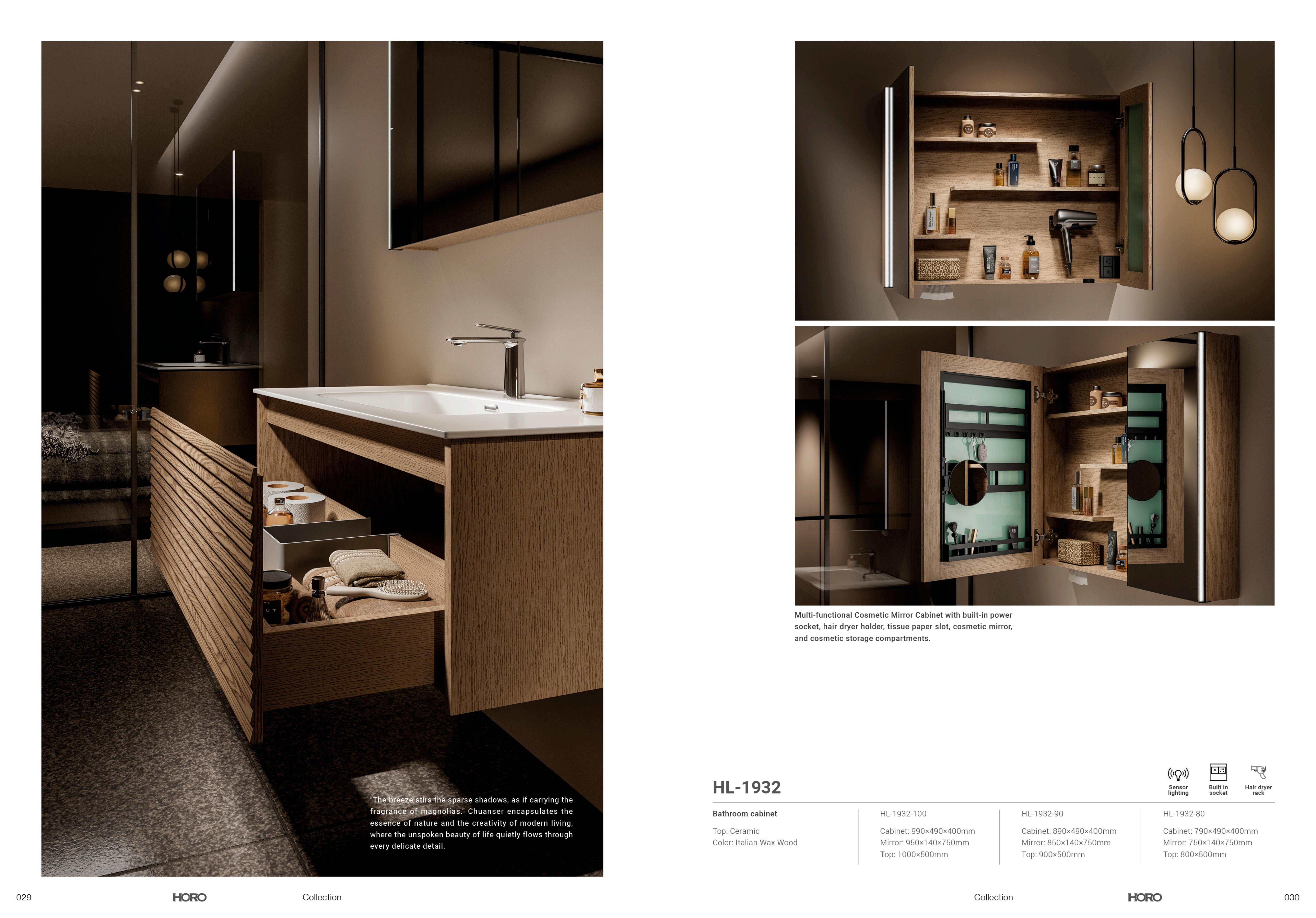 Multi-functional Cosmetic Mirror Cabinet with built-in powersocket, hair dryer holder, tissue paper slot, cosmetic mirrorand cosmetic storage compartments.